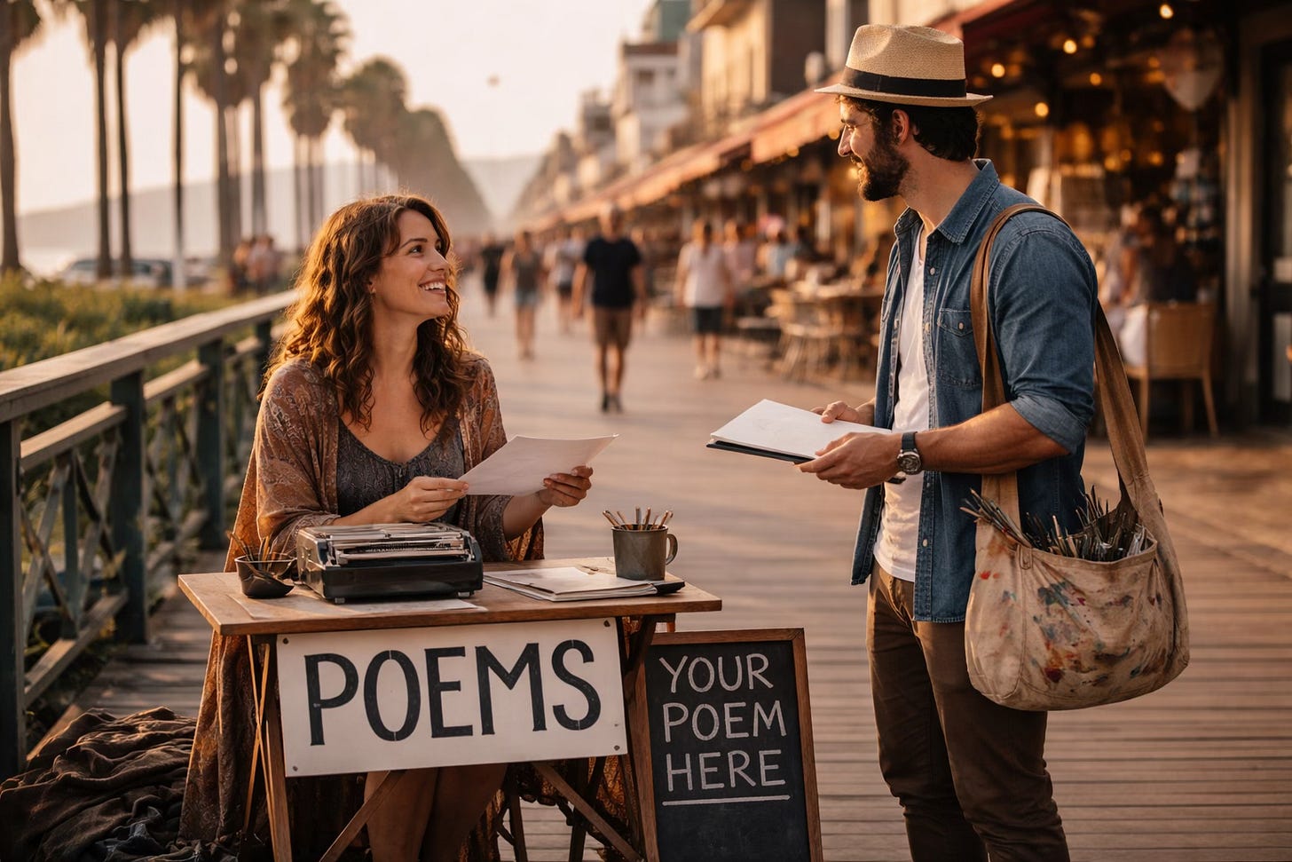 One afternoon, I stood on a boardwalk in San Diego in the heat of the sun. It was a prime location for tourists and locals alike. An artist — as it turned out — stopped and chatted. I gave him a reading and a poem to take away. A few dollars was a usual donation. I unwrapped what I thought were two dollar bill notes, only to find a hundred dollar bill inside.